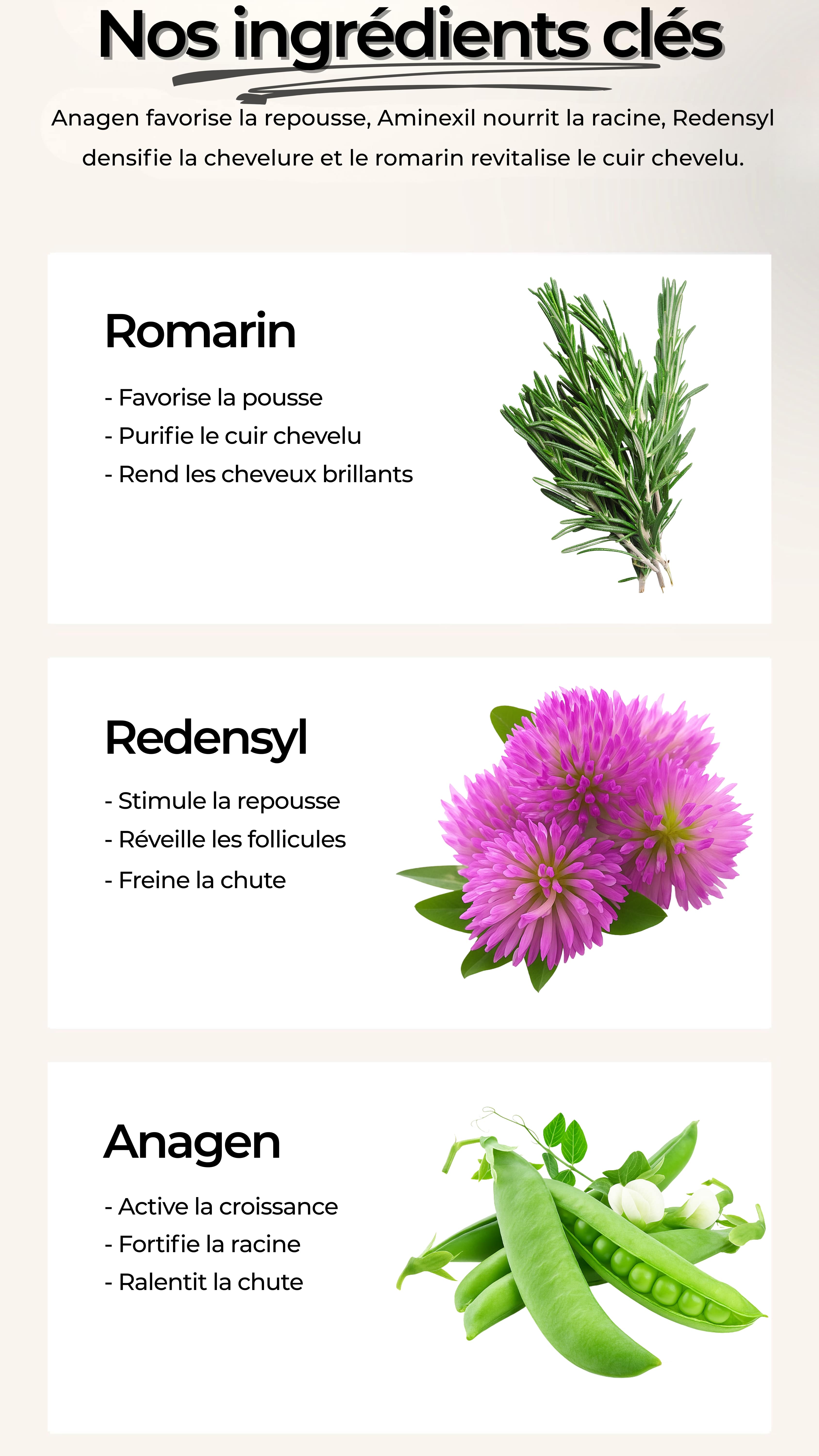 – Chaque ingrédient est soigneusement sélectionné pour traiter la cause réelle de la chute des cheveux, offrant une solution durable pour des cheveux plus forts et plus sains.